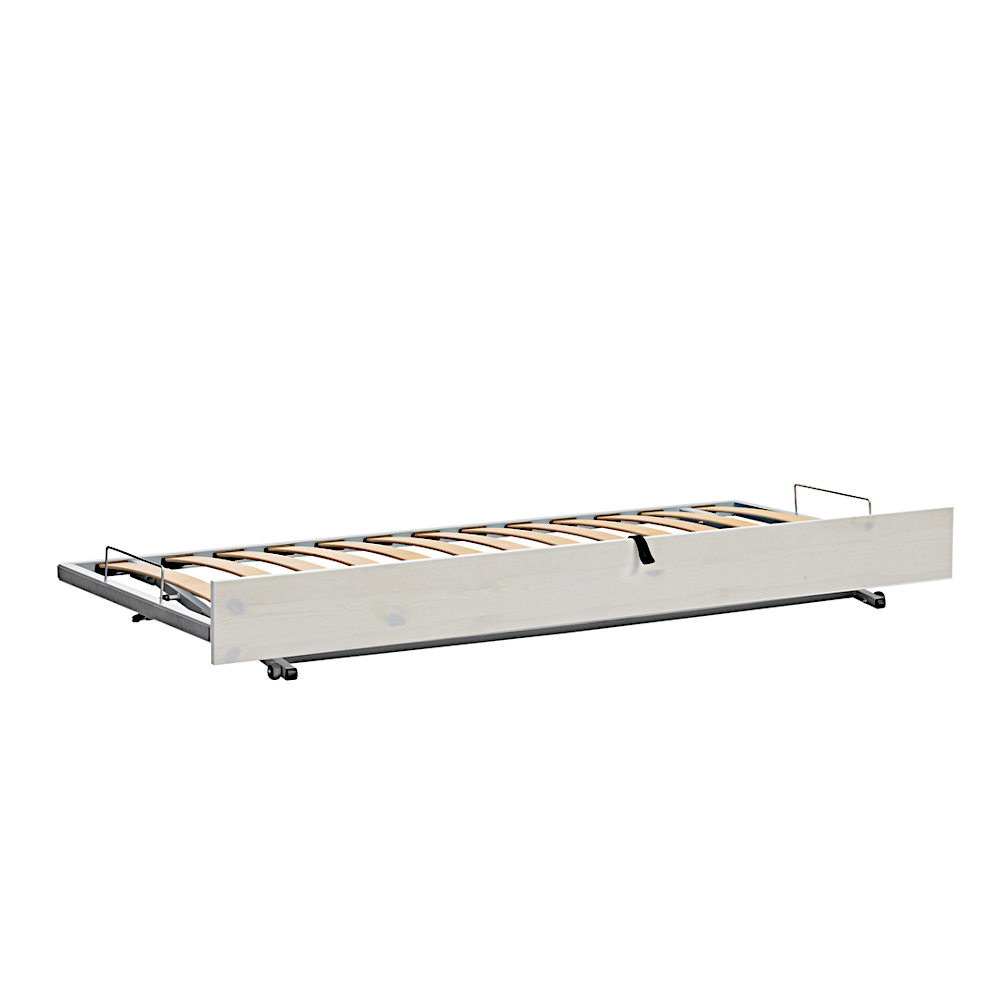 ...die Gäste können kommen... Ob Mama, Papa, Geschwister, Großeltern oder Freunde - das super-praktische Gästebett ist für Übernachtungsgäste vielseitig einsetzbar... Es wird unterm Kinderbett verstaut und nutzt somit den sowieso vorhanden Platz optimal aus. Bei Bedarf wird das Gästebett auf den Rollen ganz einfach vorgezogen. Dann einfach nu an der Lasche nach oben ziehen - schon steht das stabile und bequeme Gästebett auf der selben Ebene, wie das Hauptbett. Da es dort nicht befestigt ist und für sich allein steht, kann es auch an einem anderen Ort im Zimmer oder in einem anderen Zimmer freistehend aufgestellt werden! Der eingebaute Lattenrost bietet den Komfort eines vollwertigen Betts, der Metallrahmen sichert absolute Stabilität und Haltbarkeit.