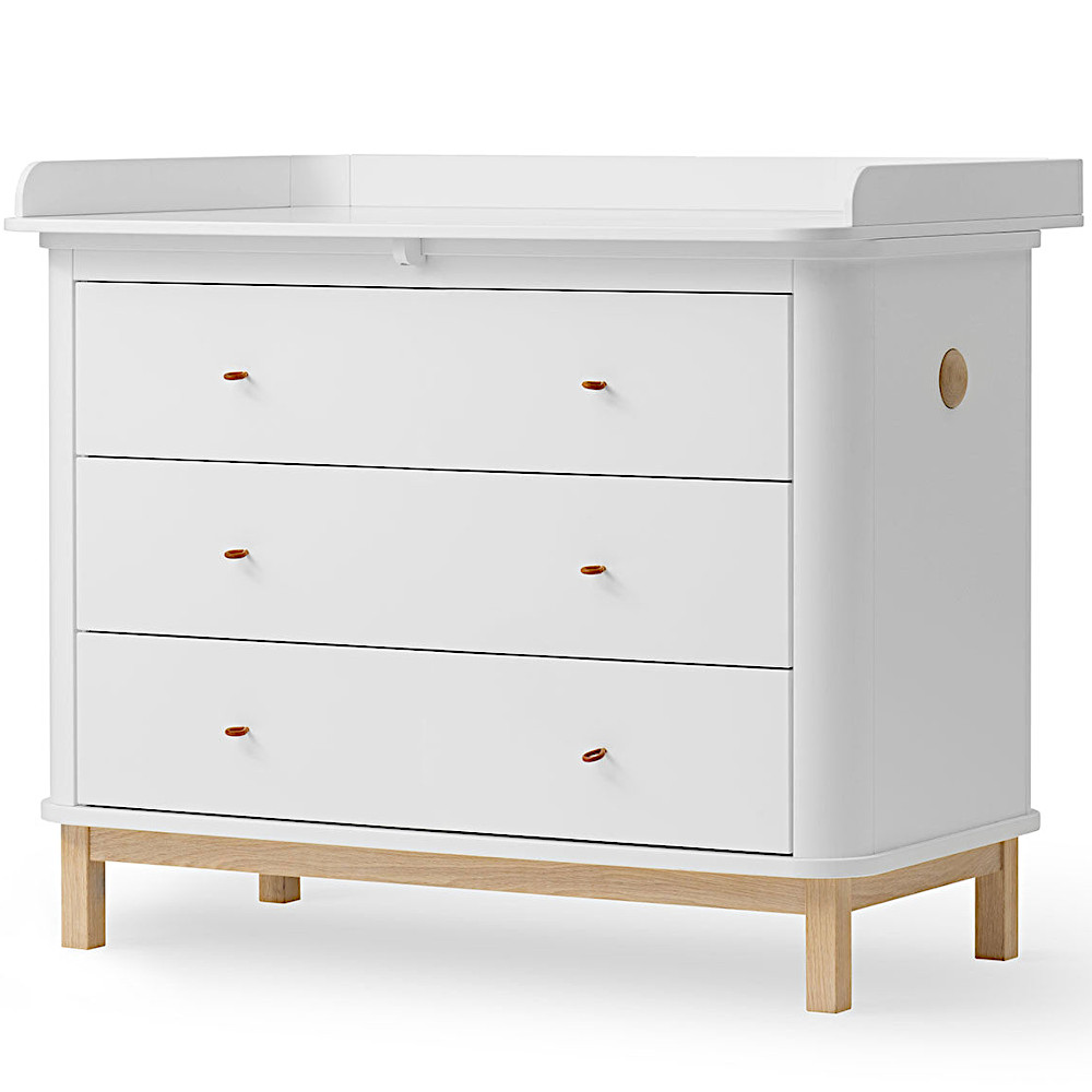 Die runden Kanten der Wickelplatte und der große Wickelplatz schaffen eine sichere Umgebung und ausreichend Bewegungsspielraum für Kind und Eltern. Das skandinavisch schlichte Design erzeugt stilvolle Leichtigkeit. Die WOOD Wickelkommode zeichnet sich durch ihre runden Formen aus. Die drei soliden, großen Schubladen laufen auf qualitativ hochwertigen Schienen. Eine spezielle Soft close-Funktion dämpft das Schließen der Schubladen, so dass kleine Finger nicht eingeklemmt werden. Die Seiten sind jeweils mit runden Haken aus Eiche ausgestattet, die man für Sachen nutzen kann, um sie schnell griffbereit zu haben.